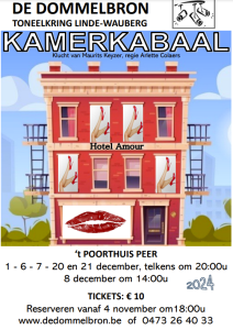 Wat als de muren van een hotelkamer konden praten? Een hotel is immers dé uitgelezen plek waar mensen van diverse pluimage mekaar ontmoeten. Zo ook in het toneelstuk ‘Kamerkabaal’, waar Yvonne en Rik – beiden hebben al een relatie achter de rug – voor de tweede keer een huwelijksnacht zullen doorbrengen. Daarbij maken zij kennis met de ietwat sullige Werner en zijn erg dominante vrouw Brenda. Na de rare ‘kennismaking’ schrikken beide koppeltjes zich pas echt een hoedje wanneer blijkt dat er een oude snoeper in het hotel logeert, die geen kans onbenut laat om zijn wildste fantasieën te botvieren. En om het plaatje helemaal compleet te maken, loopt er ook nog een sensuele prostituee door de wandelgangen. Kamermeisje Cindy, een pittige maar ook ondeugende tante, draaft als een furie door het hotel om de chaotische toestand in de hotelkamers op haar eigengereide manier onder controle te krijgen. Kortom, er is veel kabaal in ‘Kamerkabaal’.  Gluren jullie mee?